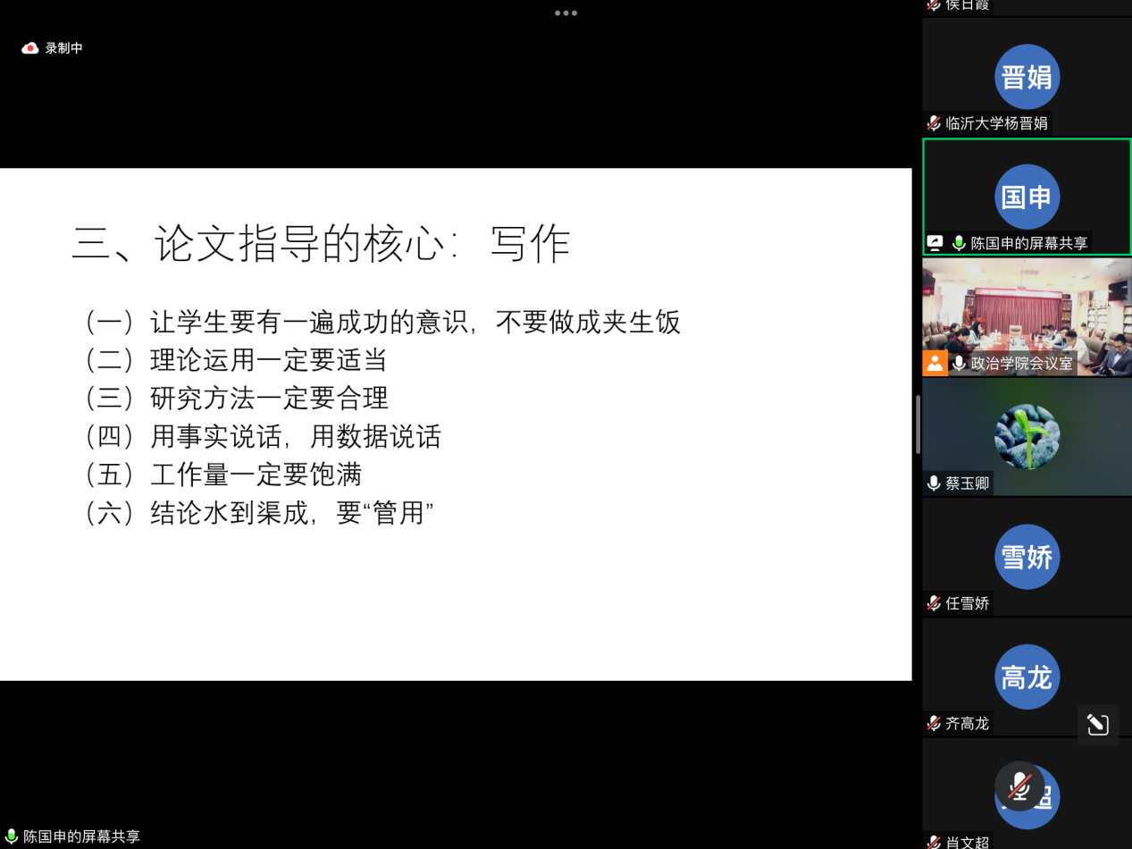 陈国申教授作线上报告交流,深入浅出地分享了指导MPA论文写作全过程的经验。陈教授从选题、开题、写作、修改直至最后的签字确认等各个环节出发,系统地介绍了指导MPA学生撰写高质量论文的方法与技巧。为参会的MPA导师提供了宝贵的操作指南,有助于提升论文指导工作的效率与质量。
