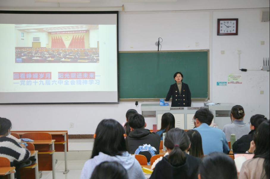 党委书记卢瑞霞于JS303为2020级全体入党积极分子讲授“回看峥嵘岁月,阳光照进未来”学习党的十九届六中全会精神党课。