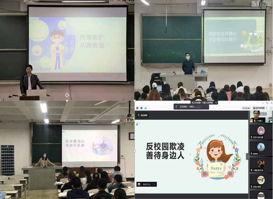 各年级各班分别于4月28日、4月29日在JA206、JA103、JA302和腾讯会议线下线上方式召开安全主题班会。本次班会分别由18、19级辅导员王元如、20级辅导员耿晓敏、21级辅导员马腾主持,各年级各班学生全体参加。班会主要分为疫情防控、消防安全、预防诈骗、预防溺水、反对校园欺凌、抵制邪教六个部分。