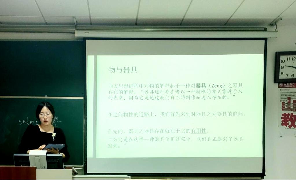 2021级姜家慧同学为大家分享了《艺术作品的起源》一书。艺术就是真理自行设置入作品,对作品之本质的追问进一步指向了对作品的追问。海德格尔将物之物性的三种解释视为对物之物存在的扰乱,思考物之物性时应归于存在者那里。