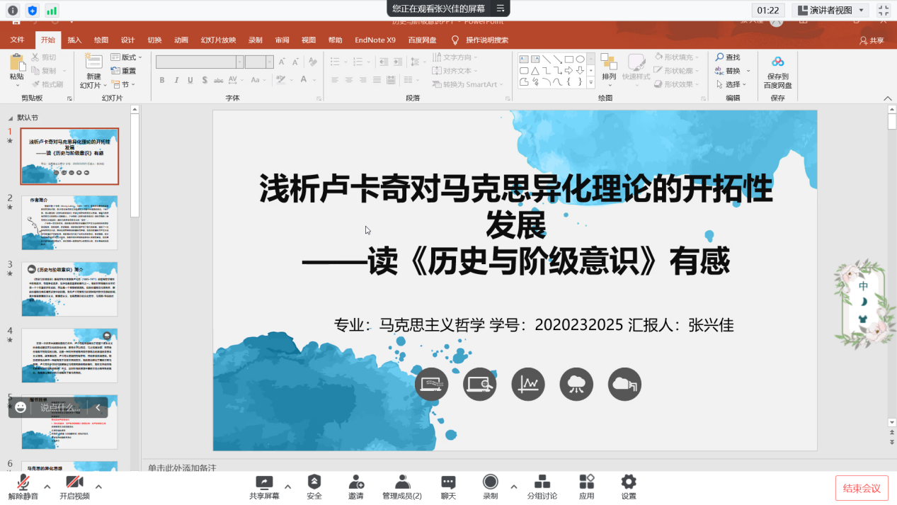 首先,2020级张兴佳同学带来《历史与阶级意识》一书进行分享,并通过对此书的展开,着重分析卢卡奇物化理论与马克思异化理论思想的比较,进而阐释卢卡奇对马克思异化理论的开拓性发展。