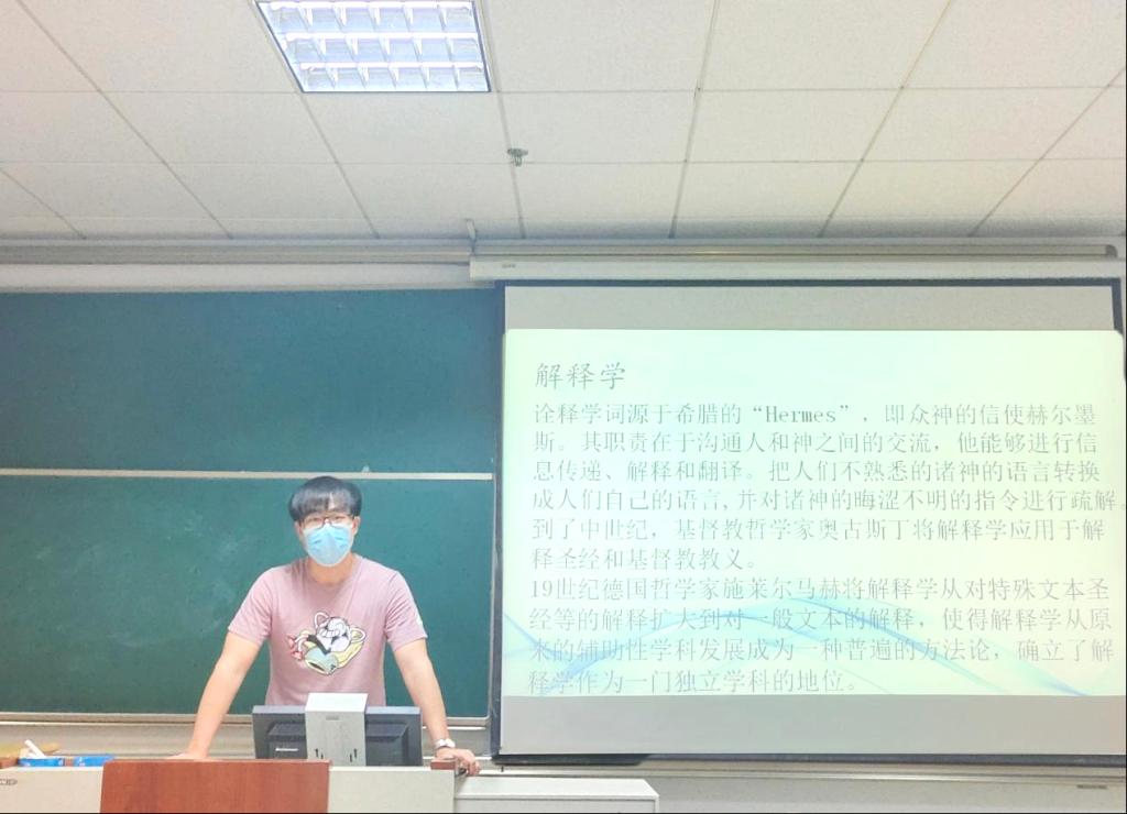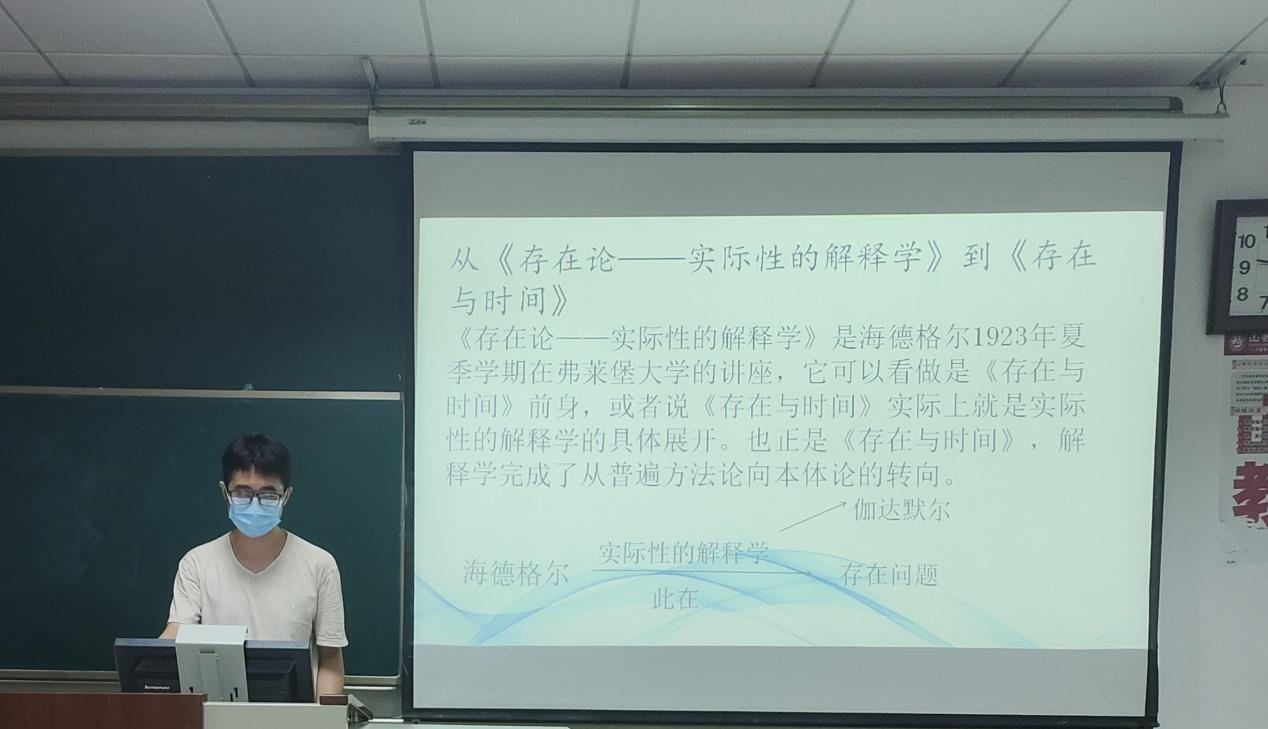 随后,2021级高荣齐同学分享了《存在论——实际性的解释》的读书心得。分享从解释学定义和发展入手,阐述本书作者海德格尔是解释学第二次转向的奠基人物,对从方法论解释学转向本体论解释学的发展具有重要贡献。