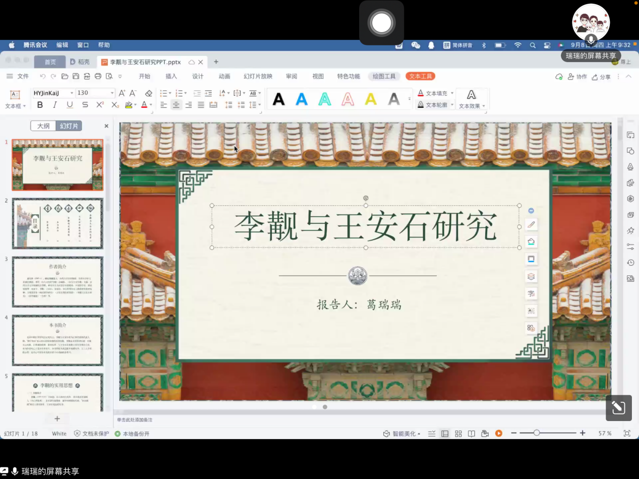 最后,由靖军博士进行点评。靖军博士根据同学们的读书情况提出了建议,第一,研究问题应深入思考其中的内在逻辑和生成逻辑,将其内化为自身想法进行输出,分享时注重内容的层次感和历时感,抓住中心点,发散思维;第二,将历史事实与背后之理联系起来,搜集新材料,拓展研究深度与广度。