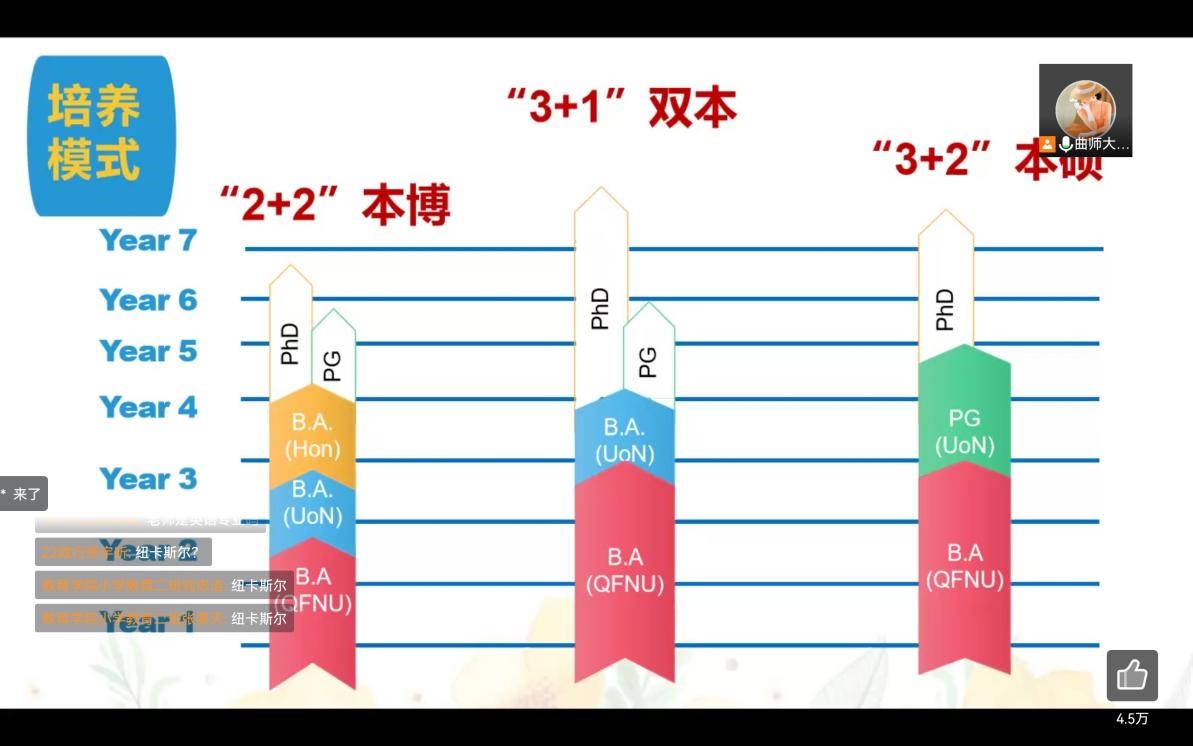 陈晓丽老师以“云端”和“国际化”为切入点,指出在世界多极化、经济全球化发展的当下,国际化进程正不断推进,社会发展则需要更多的国际化人才。基于大数据下的大学生就业实际情况以及出现的“学位贬值”的现象,她强调,拥有国际化思维与意识、生长在国内外不同教育环境下、通晓中外文化的毕业生更具有社会竞争力。随后,她从政策支持、个人规划、留学建议等方面分别给同学们进行了详细介绍,其中包括“本科3+1”“本硕3+2”等联合培养项目以及“2+2本博”“3+1双本”等培养模式。最后,陈老师希望同学们在大学生活中开拓自己的国际视野、在思想上融入国际化的元素、发展自己的个性,在大学中努力提升自己的国际化交际能力,有意识地打造自己的国际化竞争能力。