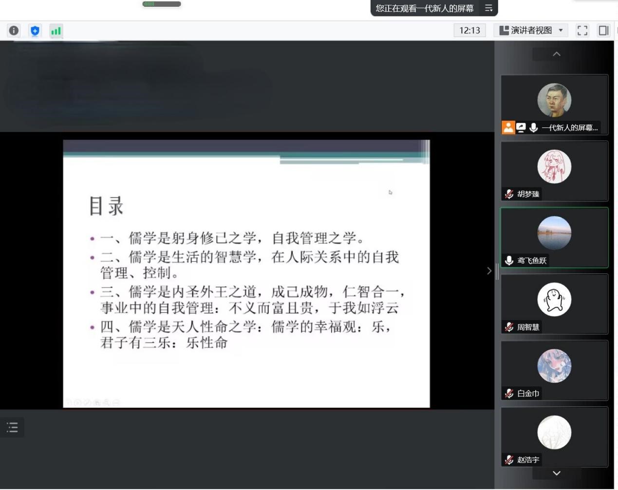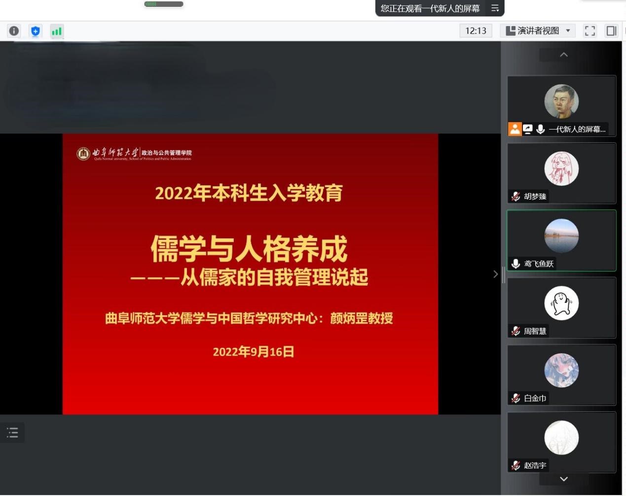 成功举办2022级新生“儒学与人格养成—从儒家的自我管理说起”主题教育,本次会议采用线上的形式召开,由2022级辅导员王元如主持,颜炳罡教授主讲,2022级全体同学积极参与。