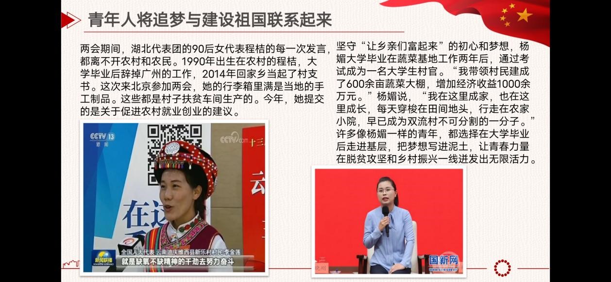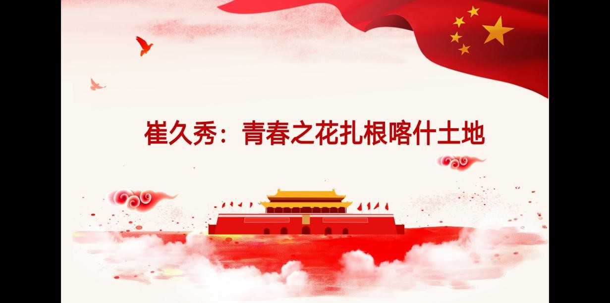 主持人带领全体新生学习崔久秀扎根西部的感人事迹。她十几年如一日扎根边疆,始终奋战在基层一线,带领群众把曾经落后的新疆喀什的一个小乡村建设得愈加富饶美丽,充分彰显了共产党员坚守初心使命、勇于担当作为的政治本色,集中体现了基层党员干部艰苦奋斗、攻坚克难的优良风范。