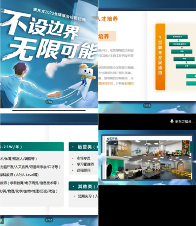 新东方教育科技集团是以学生全面成长为核心,以科技为驱动力的综合性教育集团。会议伊始,新东方山东省域负责老师向大家介绍新东方校园环境和工作环境,员工晋升培养方案,如何选择职业等内容,并告知同学本次招聘有“不设边界,无限可能”这一特点。随后济南、青岛、烟台、潍坊四地校区负责人为大家介绍本次的招聘岗位和薪资条件,大体分为教师类、运营类和短期实习。重点强调教师类职位:素质类教师、素养类教师、托福/雅思/国际学科教师、职校高考专业课教师和高中教师,同学们可以结合专业知识和个人能力和兴趣作出选择。会议最后,各校区负责老师认真解答同学们的问题,并鼓励同学们积极报名,勇于尝试。