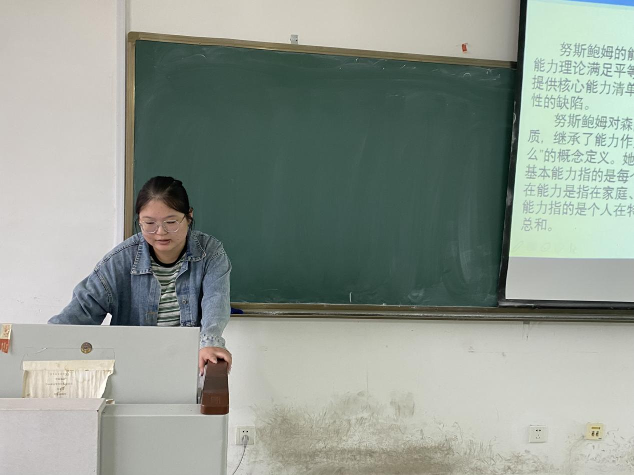 2022级徐健同学分享的是《玛莎·努斯鲍姆的能力进路与全球正义》,她从罗尔斯正义论下的问题:国家主义和世界主义,玛莎·努斯鲍姆的能力进路,玛莎·努斯鲍姆的能力进路的能力进路与全球正义三个方面着手,详细阐述了努斯鲍姆的能力正义论,并扩充了罗尔斯关于“公平的正义”。