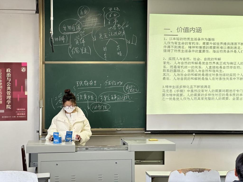 2022级郑爱莉同学分享的是卡尔·马克思所著的《1844年经济学哲学手稿》,她讲到马克思在此书中对资产阶级经济学做了深刻的批判。其次,马克思批判地改造了德国古典哲学的异化概念,提出了异化劳动理论,并将其与资本主义的社会关系结合起来,初步论证了共产主义的必然性。最后,马克思在手稿中还论述了劳动实践对于人类文明和历史进步的伟大意义、指出整个世界历史不外是人通过人的劳动而诞生的过程。最后,她就“美好生活的前提是充裕的物质生活条件,与工人相比,资本家已占有了大量财富,那资本家具备了实现美好生活的这一基本条件了吗?”这一问题提出了自己的看法。