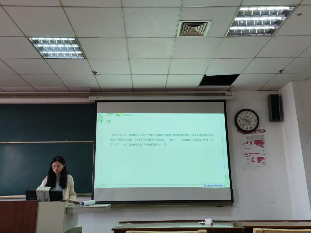 2023级左文萱同学就王守仁的《传习录》进行分享,她认为《传习录》中“知行合一”的思想体系主要是视“致良知”为纲,以“心即理”为体,有效地化解了程朱理学与陆九渊“心学”的内在矛盾,“知行合一”为用,即用显体,承体达用,希望人人都可以成为圣人。