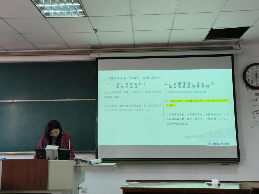 2023级张子萌同学分享罗安宪的《儒道心性论的追究》一书,从道学篇、儒学篇、儒道会通篇和传统与现代篇进行阐述。她提出,本书作者关于儒道心性论的研究是基础性的,在阅读时要更新对研究问题的认知。
