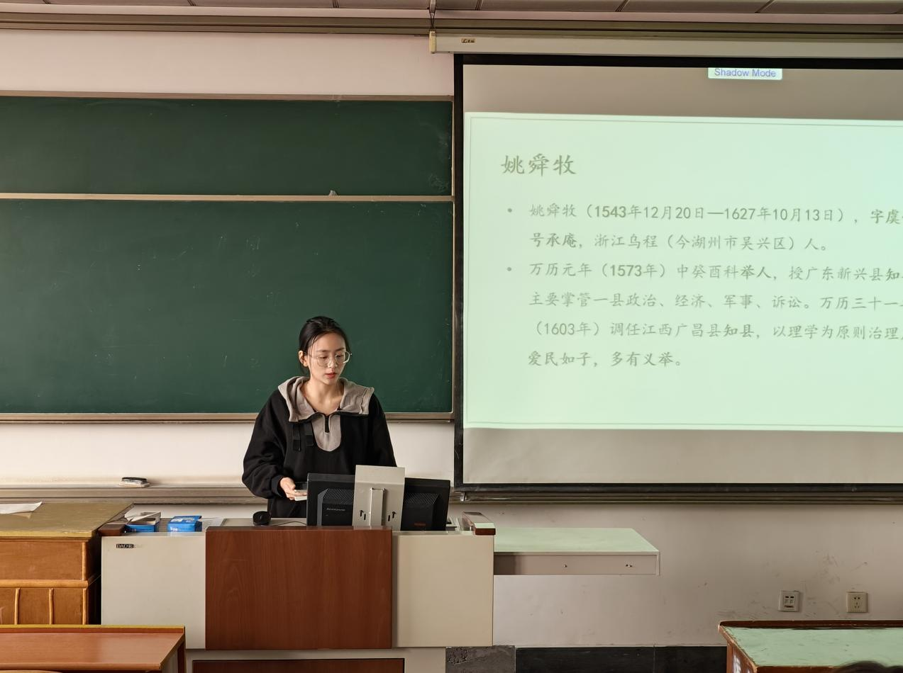 2022级孙彩惠同学就姚舜牧《药言》一书进行分享。《药言》是姚舜牧创作的家训作品,亦名《姚氏家训》,本书对中国社会人际交往、理家修身、个人生活原则等方面有一定的指导意义。她结合自己的阅读感悟提出了“在今天怎么样才算是一个好人?”这一问题,引发在场同学的思考,大家纷纷发表了个人看法并交流了意见。