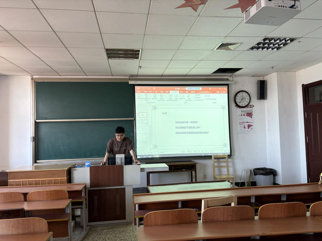 2023级孙烨同学结合《唯物辩证法和形式逻辑的关系——关于20世纪30年代、30年代的观点》与大家进行分享,介绍了相关人物的思想观点,并引导大家思考:辩证法是不是一种逻辑?辩证法和形式逻辑的关系是怎样的?形式逻辑是不是形而上学?