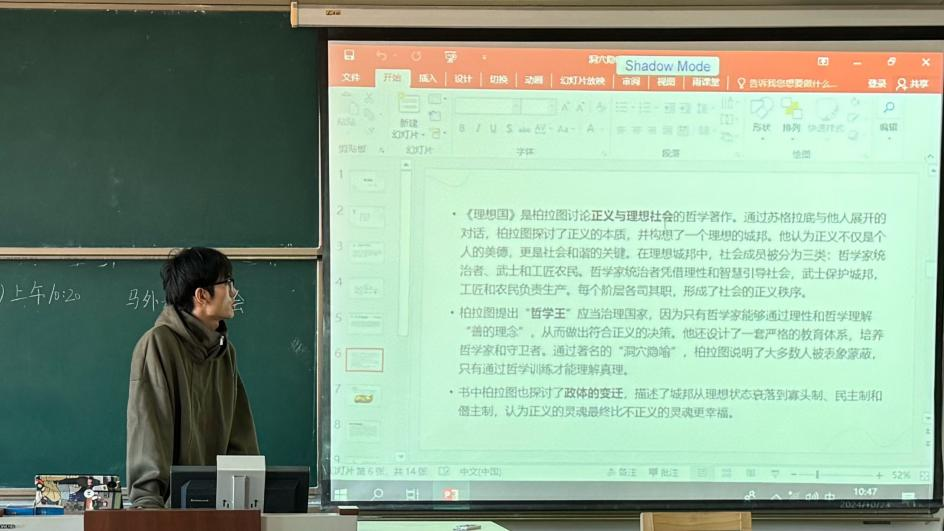 2023级刘佳鑫同学分享的是柏拉图的《理想国》这本书,他介绍了柏拉图的正义与理想社会、“哲人王”、理想城邦的政体制度等,并着重分析和解读了“洞穴隐喻”这一概念。最后,他从“洞穴隐喻”角度出发向大家提出了“正义是否要比不正义好”这一问题,引发了同学们的深入思考。