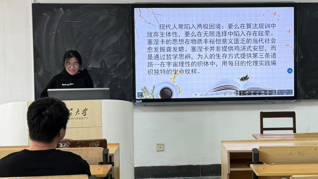 2024级刘飞霞同学分享的《论心灵之安宁》,她阐述了塞涅卡对哲学、美德、死亡、学习、恐惧、享乐、财富等诸多生活议题的看法,提出了如何在动荡世界中保持内心平静的问题。