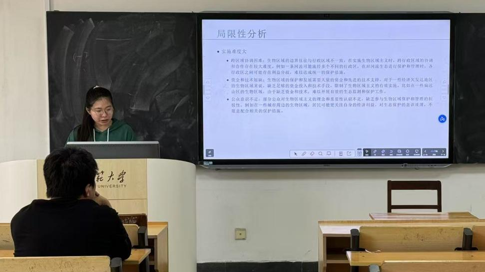 2023级孙红轩同学分享的是柯克帕特里克·塞尔《大地上的栖息者——生物区域构想》,她结合书中内容着重分析了全球化背景下地方意识的局限性,提出了生物区域主义如何从哲学角度回应人类中心主义挑战的问题。