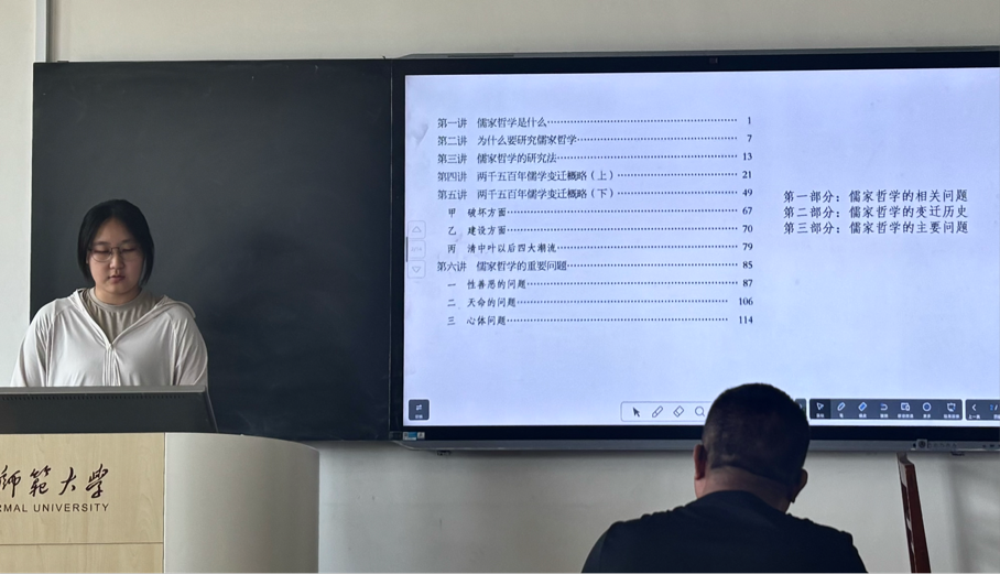 2024级李颖同学分享了梁启超先生的《儒家哲学》,她重点解读了书中关于"仁学"的现代诠释,特别分析了书中"内圣外王"的实践路径,并提出了一个富有现实意义的问题:"面对现代原子化社会的问题,传统儒家伦理能提供怎样的出路?"这一问题引发了同学们对儒家思想现代价值的深入探讨,大家就如何将"仁爱"、"忠恕"等传统美德转化为现代社会资本展开了热烈讨论。