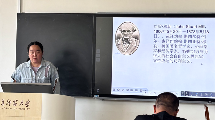 2023级魏岩楠同学分享了约翰·斯图亚特·密尔的经典著作《功利主义》,该书系统阐述了"最大幸福原则"这一核心思想,深入探讨了如何通过促进整体幸福来实现社会进步。她在分享的最后提出了一个极具思辨性的问题:"为了多数人的幸福,是否可能牺牲少数人的正当权益?"这一问题引发了同学们对功利主义伦理观的深入思考。