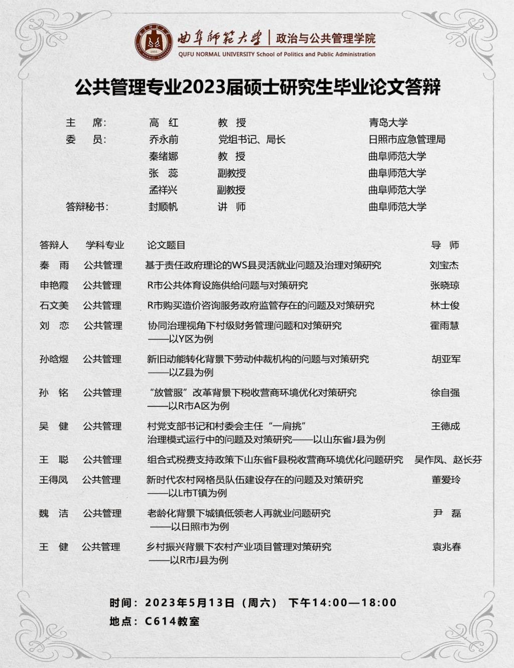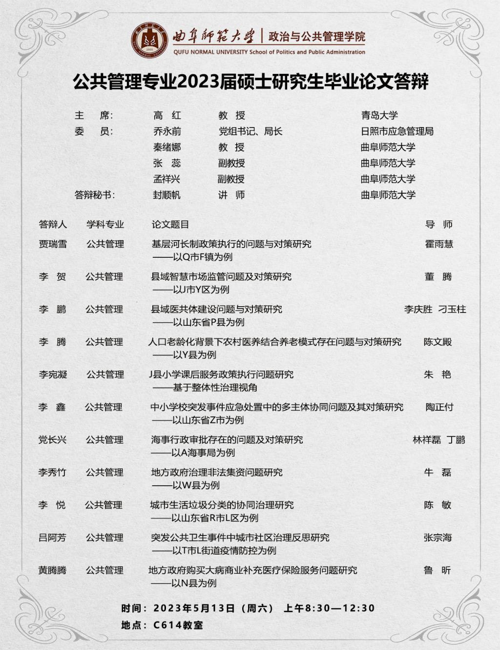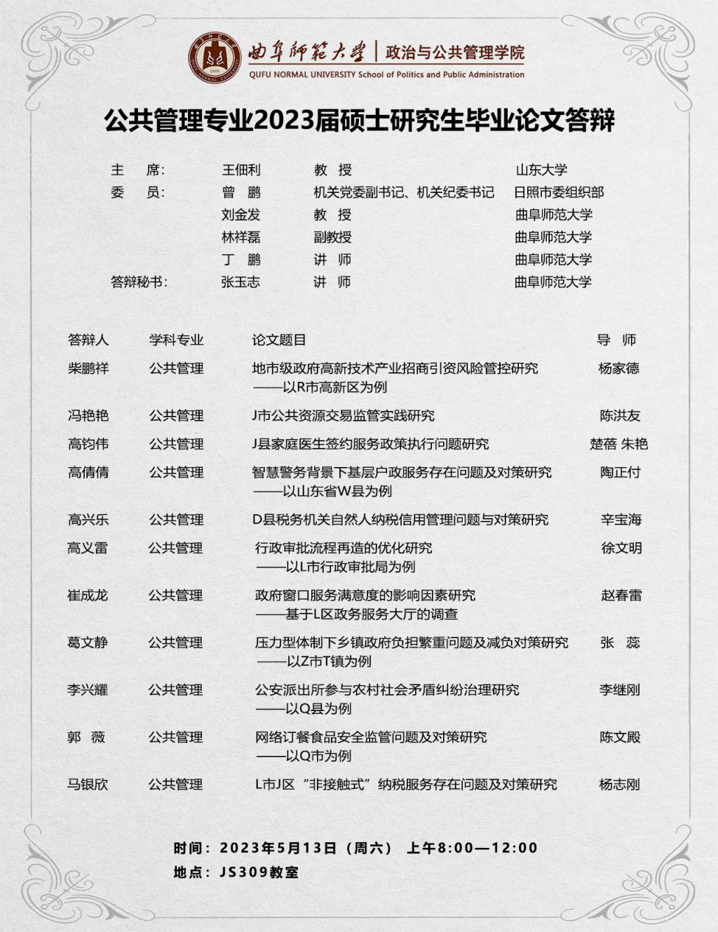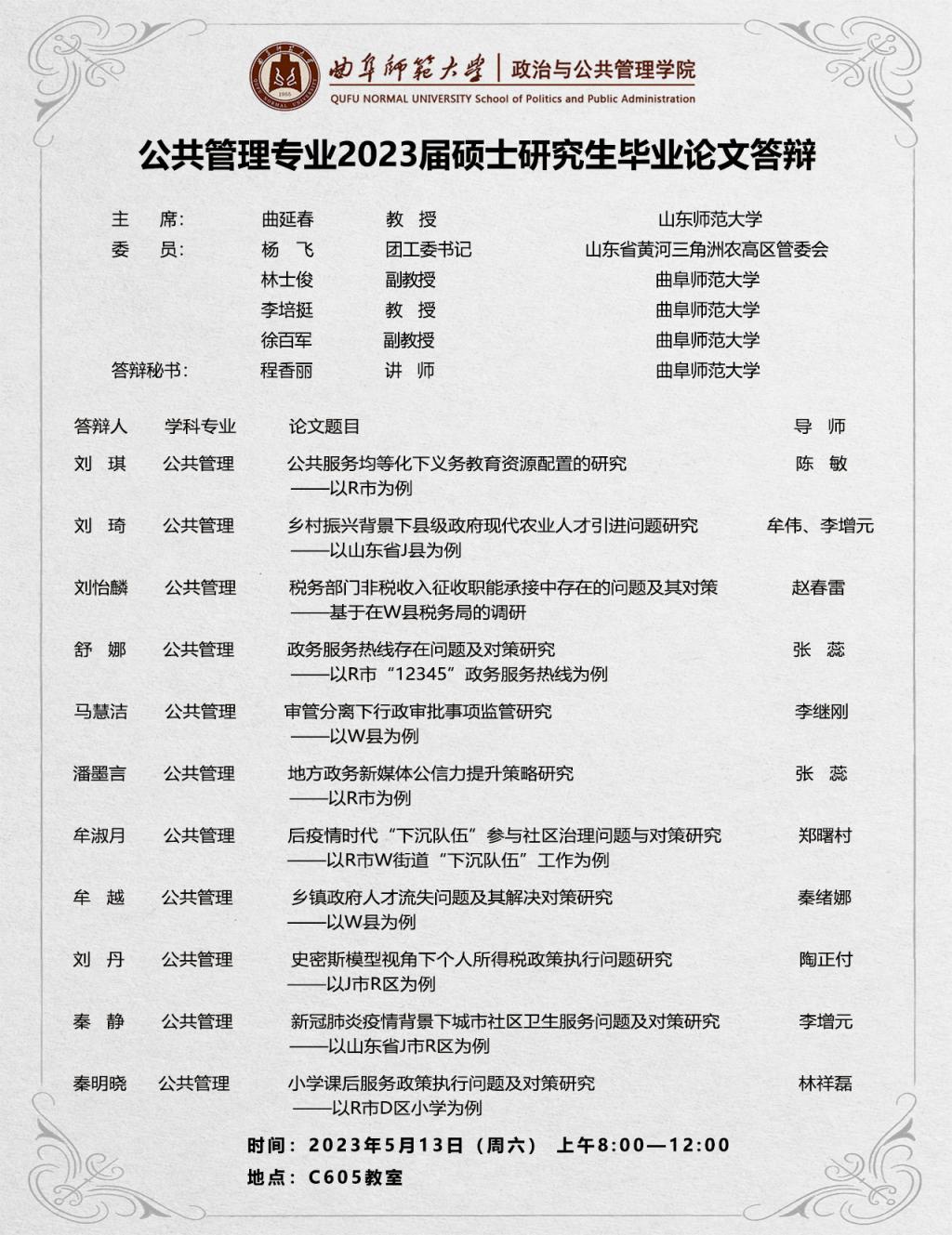 政治与金沙娱乐 2023届公共管理硕士研究生学位论文答辩公告