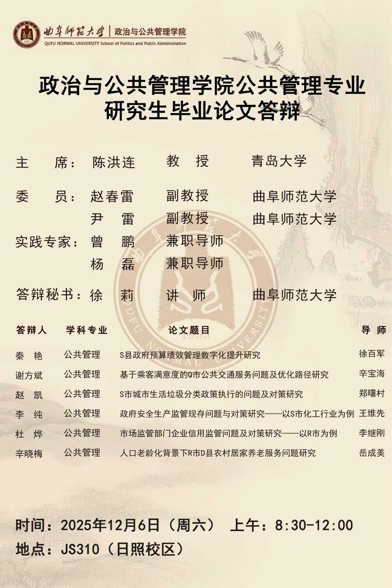政治与金沙娱乐 公共管理专业研究生毕业论文答辩公告