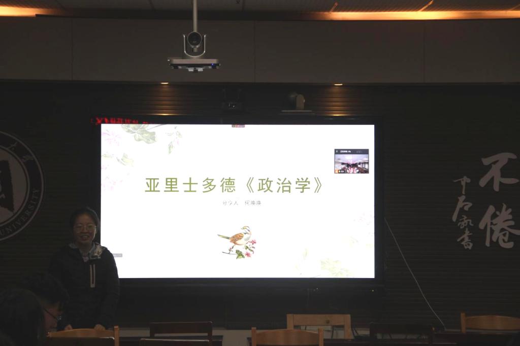 2021级何焕焕同学分享了亚里士多德的《政治学》,其中,主要讲了第一卷,第一部分是关于城邦和家庭的起源,即城邦显然是自然的产物,人天生是一种政治动物,第二部分是关于奴隶和财产的管理。