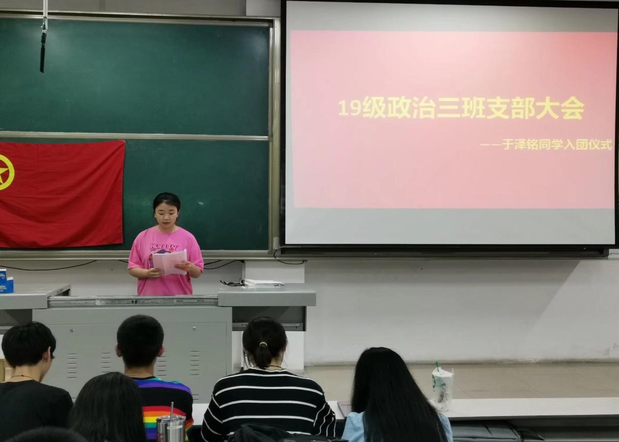团委2019级政治二班及政治三班团支部团员大会暨团员纳新大会分别于JB103、JA302成功举行,分别由政治二班团支书王晓彤、政治三班团支书肖昀如主持,两个支部全体团员积极参与。