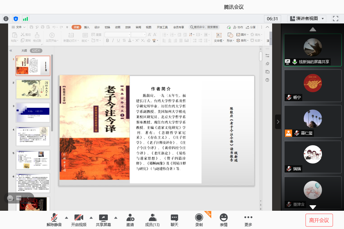 本期政研论坛读书交流会围绕中国哲学相关书目及人物展开讨论。首先,2020级钱新瑞同学为大家分享陈鼓应教授的《老子今注今译》。本书以《老子》原有篇章为序,先引原文,再加注释,而后是今译,最后是引述,对《老子》作了全面介绍。钱新瑞同学主要分享了书中老子“无为”的观点。他指出“无为”不是无所作为,随心所欲,而是要以辩证法的原则指导人们的社会生活,帮助人们寻找顺应自然、遵循事物客观发展的规律,要有所作为,但不是强作妄为。