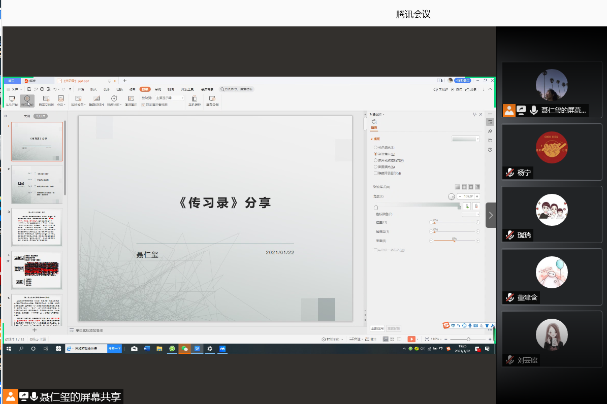 随后,2020级聂仁玺同学就明朝著名哲学家、政治家王阳明的代表作《传习录》一书进行了分享。《传习录》是王守仁讲学的语录,表述了阳明心学的主要论点。书中提出了心外无物、心外无理的命题,由此强调客体存在价值在于认识主体的依赖作用。聂仁玺同学围绕王阳明心学发展、致良知与四句教、至善展开阐释,她提出处于21世纪快速发展的今天,面对外来的和内在的障蔽更需要修养身心,通过“格物”、“致知”等修养功夫去除人心杂念,因而阳明的致良知说具有划时代的意义,应该积极探索并学习其具有重大借鉴意义的思想内容。