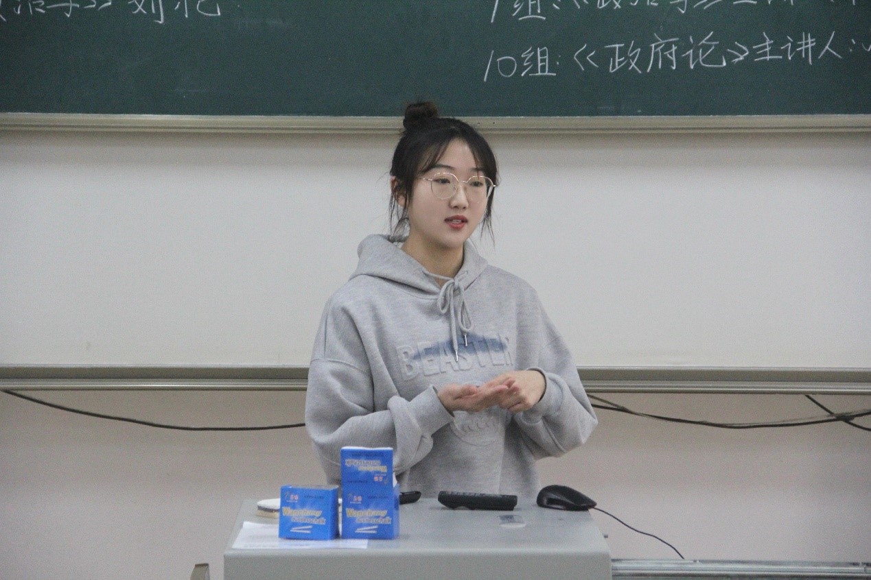 比赛伊始,主持人阐明阅读经典著作的重要意义,并简要介绍比赛的规则流程。本次比赛共有十个小组展示阅读成果,涉及书目主要包括《无政府、国家和乌托邦》《理想国》《政治学》《正义论》等经典名著。同学们通过PPT展示小组阅读成果,立足于著作的整体思想,同时融合自己对内容的理解,通过不同的视角对著作的内容进行解读分析,同学们精心的准备以及现场生动的讲解,赢得了现场观众的阵阵掌声。