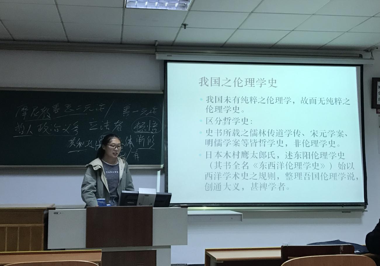 本期政研论坛读书交流会围绕伦理学相关专业书目及人物思想展开讨论。由2019级王芸芸同学分享了蔡元培的《中国伦理学史》。首先讲述了本书的内容构成,其次着重对伦理学和修身书的区别以及伦理学史和伦理学根本观念的区别进行了深入解析:伦理学者学理性较强,而修身书者则是更注重实践准则方面,这是其一的区别;对于其二的区别,应从二者的体制和内容方面的主客观加以考虑,此外伦理学范围广阔,但会导致著述不纯,对于伦理学史,也要与哲学史相区别。所以要秉承着批判继承的态度,这样才能更加深刻的理解其含义。