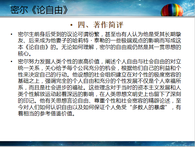 李得序同学从作者生平、著作简介、主要内容以及著作评析四个方面分享了密尔的《论自由》,李得序同学对主要内容进行了展开论述,首先,论思想自由和讨论自由,从不能压制思想和讨论自由的两个观点到进一步论证思想和言论自由到否认绝对的、无条件的言论自由。其次,论个性为人类福祉的因素之一,人性自由是天才和社会精英发展的必要条件,主张打破社会暴政。密尔将自由主义理论直接推广到经济生活,尤其是推广到与自由竞争有关的活动中去,他的有关思想言论自由、尊重个性和社会宽容的精辟论述,至今对人们如何认识自由以及如何保证个人免受“多数人的暴虐”具有重要的参考借鉴价值。