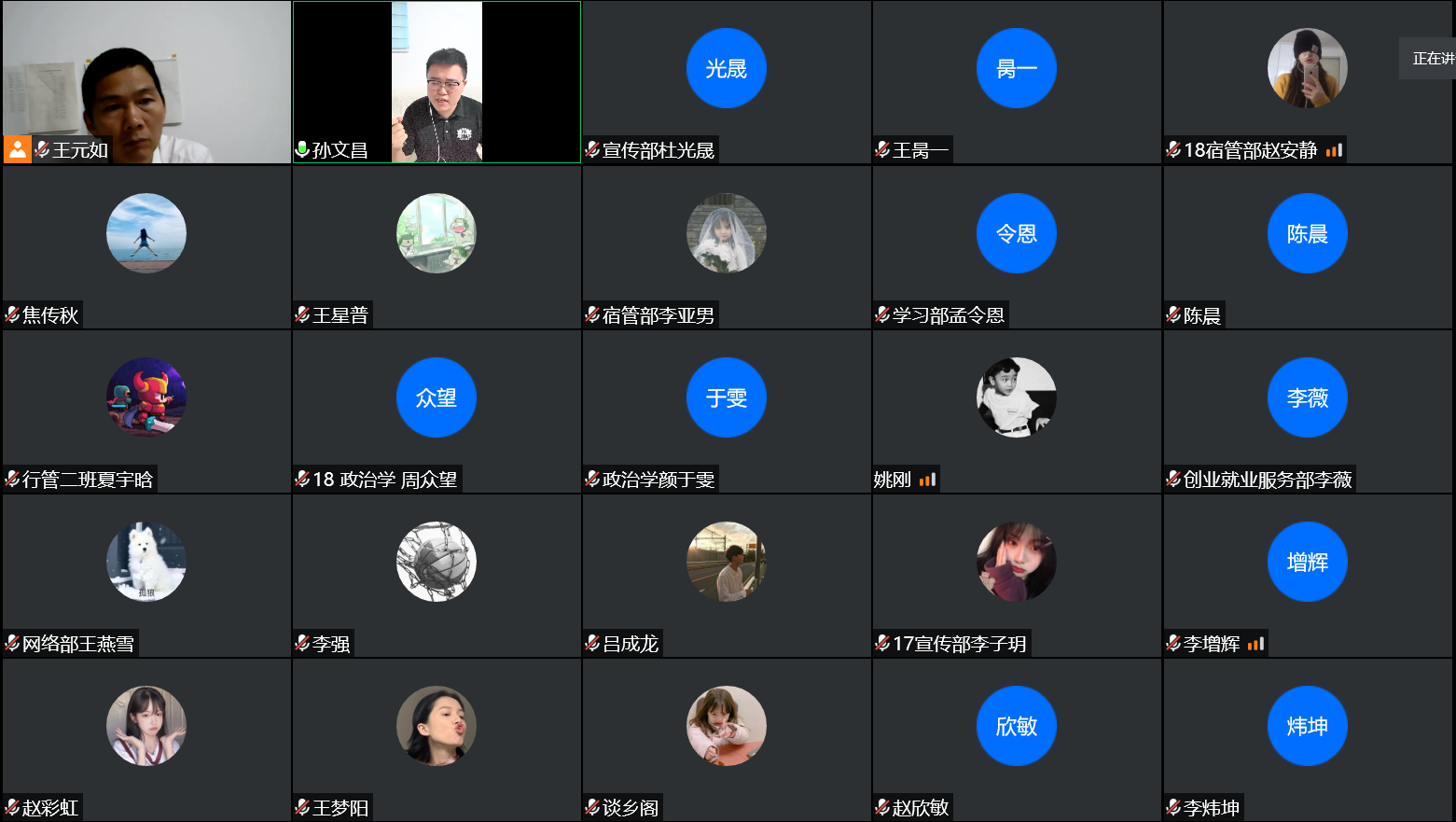 由于受到疫情的影响,同学们暂未返校,2018级竞选采取线上会议的形式进行。会议伊始,王元如简单致辞,表达对竞选选手的鼓励和对本次竞选的无限期待。在主持人明确竞选顺序后,竞选组织部的成员开始连麦答辩,打响了本次竞选的第一枪。本次会议本着公平公正公开的原则,以建立团结协作、勇于创新的学生骨干队伍为目的,对金沙娱乐 2018级参与换届选举的学生干部进行综合考察。竞选成员们按竞选的部门职位依次发言。他们在演讲中分享自己在学生会工作中得到的经验和教训,畅谈自己对部门整体和部门相关活动的认识和理解、对竞选职位的认识,以及对竞选成功后部门未来的规划等。竞选者们语言条理清晰,自信地陈述个人展望,沉着冷静地表达自己的观点,即使隔着屏幕依旧可以感受到他们满腔的热血和积极的态度。会议最后,张忠凯对本次竞选做出总结讲话。他指出本次学生会换届竞选的职位变动问题,并强调作为学生干部要对学习成绩、综合评价等方面要有一定的要求,学思践悟;说到就应当做到,应在以后的工作中按今日所言认真履职,不忘初心;他也鼓励同学们要摆正心态,无论竞选成功与否都要继续严格要求自己。