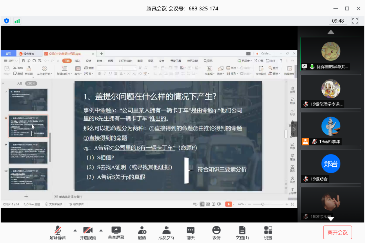 本期政研论坛读书交流会围绕马克思主义哲学以及外国哲学相关书目和人物思想展开讨论。首先,2019级徐泽鑫同学分享了西哲的相关内容:“盖提尔问题”,盖提尔问题也称做“盖提尔悖论”,“盖提尔例证”,是对柏拉图《泰阿泰德篇》中命题知识一直被标准地定义为已被证明的真信念的反例,盖提尔问题的出现,是传统知识论要求的对本质性、纯粹的认知性的无限追寻使其自身走入困境。随后,2019级刘上上同学分享了《共产党宣言》,本纲领的问世有深刻的社会经济背景和阶级根源,具有丰富的理论基础,是在建立无产阶级政党的斗争实践中产生的,《共产党宣言》在当代具有重要价值,我们必须坚定马克思主义信仰,树立共产主义远大理想,必须坚持以人民为中心,不忘初心使命。2018级的徐沁蒙同学分享了“葛兰西有机知识分子理论的建构”相关内容,葛兰西对有机知识分子的概念界定可以通过其“整体性”而非本质性的特征体现出来,并通过设置“有机性”标准,实现了知识分子的第二次整体性抽象,进而将“有机性”设置为区分新旧知识分子的最终依据。