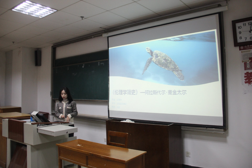 本期政研论坛读书交流会围绕伦理学相关专业书目及人物展开讨论。2018级的赵蕊同学为大家分享了麦金太尔所著的《伦理学简史》,主要从亚里士多德自制思想的背景,与实践三段论、德性、幸福的关系,自制的时代价值等方面进行了讲解。她讲道麦金太尔等人意识到近现代伦理学的种种缺陷,其中原因之一是偏离亚里士多德的德性伦理路线。复兴亚里士多德的德性伦理学是当代道德哲学的一项重要任务。亚里士多德自制思想的提出涉及了一般智慧判断到一个具体实践判断的实践推理过程,对于其他伦理思想具有十分重要的德性实践意义。