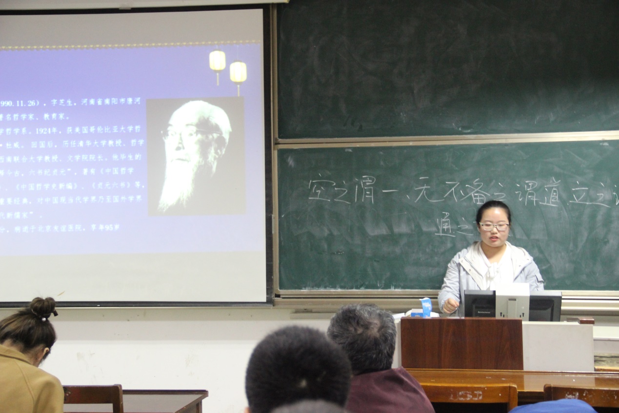 本期政研论坛读书交流会围绕中国哲学相关书目及人物展开讨论。首先,由2018级中国哲学专业的郑强同学就《黄老学论纲》一书详细介绍和总结了黄老学的产生与发展、战国时期南方北方黄老学思想、战国时期南北两支黄老学的思想比较等方面,使同学们对黄老学的思想有了深刻的了解。姚老师针对其分享进行了点评,提出读书要回归原本,不能模棱两可,要形成自己的认识。随后,2019级中国哲学专业的刘芸霞同学就冯友兰先生的《中国哲学简史》进行了分享,对冯友兰先生的生平做了简要的概述,并对其中的先秦道家思想发展的三个阶段进行了阐述:第一阶段,杨朱的为我及轻物重生思想;第二阶段,老子的道无为、物极必反、无为而治等思想;第三阶段,庄子的相对及绝对幸福、不治之治、有限等思想。2019级中国哲学专业的刘晓慧同学为同学们分享了陈鼓应先生的《老子今注今译》中的部分内容,对部分内容进行了翻译并做出自己的理解,将无为而无不为解释成自然为不据有,发挥了道家奉献精神,还围绕老子提倡的理想人格形态做出自己分析,并将其与庄子提倡的逍遥的人生境界做了对比。针对第三位同学的分享,姚老师指出无论是论文写作还是读书分享,要学会哲学语言的运用和专业思维的锻炼。在交流会分享过程中,同学们收获颇多。