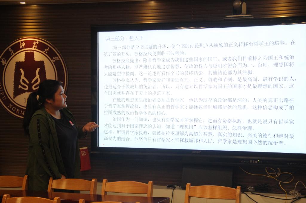 随后,刘喆同学对《理想国》作了具体分析,她将整本书分为五个部分:个人正义、城邦正义、哲人王、非正义城邦、正义者不朽。在第三部分,刘喆重点讲述苏格拉底的看法,苏格拉底提出: 除非哲学家成为我们这些国家的国王,或者我们目前称之为国王和统治者的那些人物能严肃认真地追求智慧,使政治权力与聪明才智合二为一,否则,理想国将只能是空中楼阁。苏格拉底认为,哲学家爱好和亲近真理、正义勇敢和节制,最高尚、最有学识的人最适合于做城邦的统治者,所以,只有建立以哲学家为国王的国家才是最理想的国家。