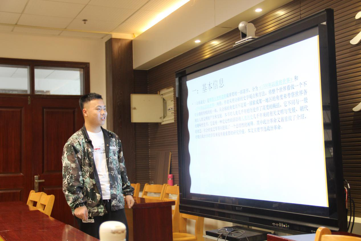 会议伊始,徐萌同学对《变化社会中的政治秩序》进行解读。她认为,本书的中心议题是正处于现代化之中的新兴国家政治秩序的稳定对于其现代化发展具有决定性的作用,但现代化的发展并不必然导致政治稳定。并从三方面阐述了主要观点:首先,20世纪五六十年代第三世界国家之所以普遍地发生政治动乱,是由于这些国家中的民众政治参与过度扩张与政治制度化水平未能相应得到提升所导致的比例失调的结果;其次政治现代化涉及权威的合理化、结构的分立和政治参与的扩大;最后,建立政治秩序的途径是组建一个组织政治,“身处正在实现现代化之中的当今世界,谁能组织政治谁就能掌握未来”。随后,张辉同学从基本信息、选文简述、概括总结、个人感悟等方面介绍了《全球通史》。