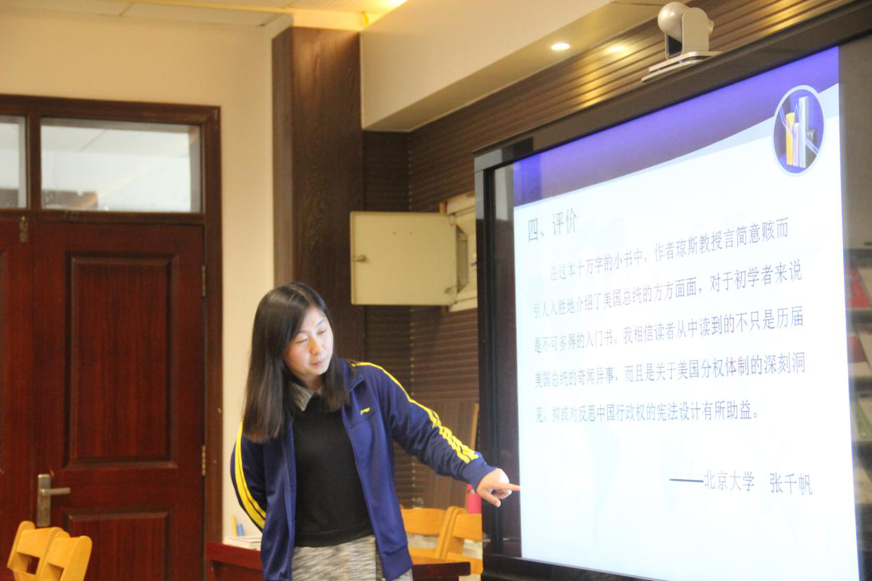 最后,张世超同学从作者简介、发展历程、主要内容等方面对《美国总统制》进行系统的论述,她认为美国总统制经历了两个多世纪,虽然打着民主的旗号,但是不是真正意义上的民主。同学们对美国总统制所反映出来的美国民主模式以及文化、意识形态的霸权主义展开了激烈的讨论。辛凯同学认为民主制度在美国取得了一定的成果,人民比较自由,以自己为榜样通过民主输出限制威胁自己的力量,这是一种意识形态领域的文化霸权;夏苗苗同学认为美国是一个多元化的国家,为了实现统一,美国必须要实现自己的民主,对外来输出自己的文化霸权。