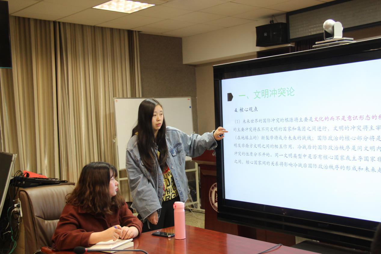 最后围绕着塞缪尔·亨廷顿的《文明冲突与世界秩序的重建》一书展开讨论交流,夏苗苗同学介绍了冷战后世界格局的变革和经济全球化的写作背景以及当代文明的总体演化趋势,张薇同学和聂文琼同学分别从未来国际冲突的根源、世界著名政治学者对亨廷顿的评价、全球政治格局的重新形成等方面进行了补充。董海波同学提出“亨廷顿对文明的划分是否存在缺陷,冷战之前的国际冲突是如何划分的”,经过讨论后,刘绍卿同学认为亨廷顿对文明的划分有些绝对化,应针对不同范式进行说明;贾岚清同学认为文明冲突一书,是从美国的立场出发服务于美国的利益,书目的考证价值很高。