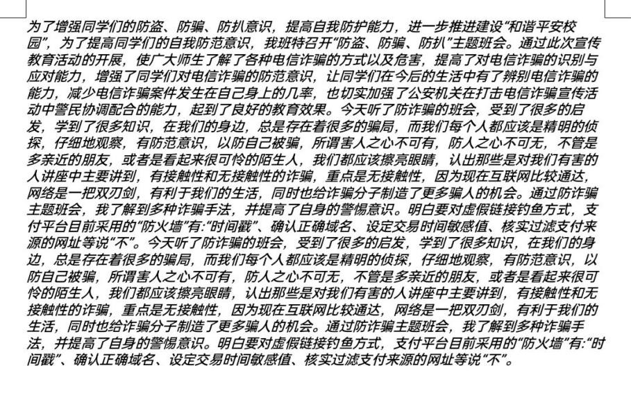 铸就防诈金盾,擦亮识骗慧眼。在各班班会上,同学们通过观看视频和金沙娱乐相关的文章就典型案例展开讨论,讲解什么为诈骗、如何辨别诈骗。随后,主持人对近期发生的诈骗案件“2.0升级版本”进行介绍,探讨诈骗基本流程和主要特点,使同学们在交流中熟悉作案手段、认清骗局陷阱,提高危险意识,了解在面临诈骗时该如何应对。本次班会具有极强的教育性和警示性,同学们纷纷表示感受颇深并于班会结束后就本次班会的所感所闻所想进行记录,撰写心得总结。