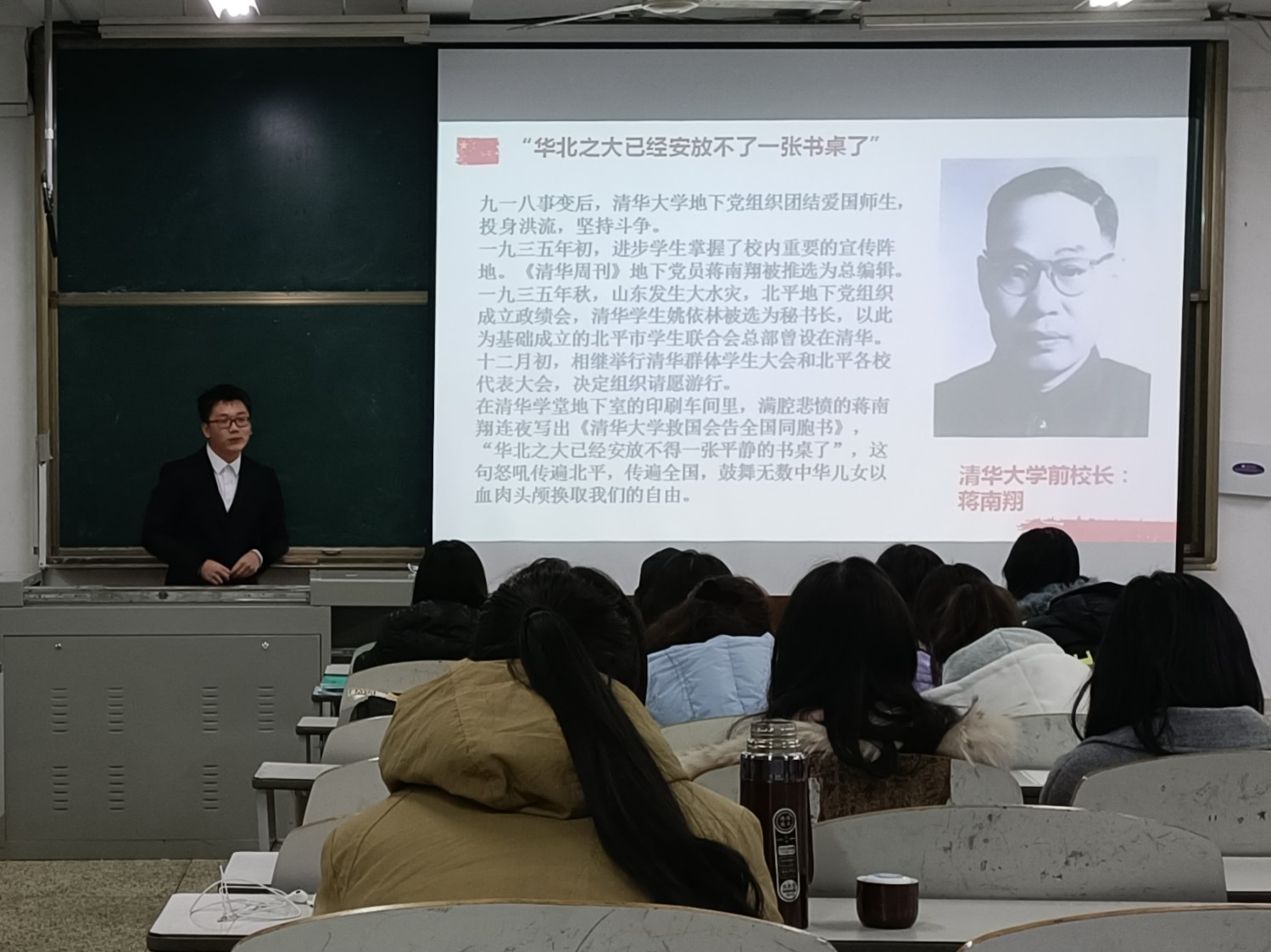 为纪念一二.九运动,传承革命精神,坚定理想信念跟党走,弘道宣讲团于12月9日分别在JA306与JB103开展纪念宣讲活动。弘道宣讲团宣讲部21级干事刘子恒与商寒雪担任本次主讲, 2021级全体同学积极参与。
