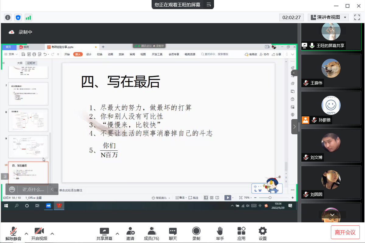 2019级向学长学习,考研经验交流会于上午九点在腾讯会议举行,邀请2018级优秀学长赵文康、杜颖、祝令硕、王旺、王子豪分享学习经验和方法,2019级全体同学积极参与。