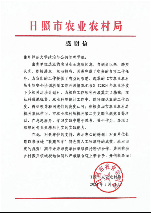 在信中,日照市农业农村局充分肯定了王志超同志仔细认真的工作态度、积极进取的工作行为和主动担当的工作风貌,对金沙娱乐