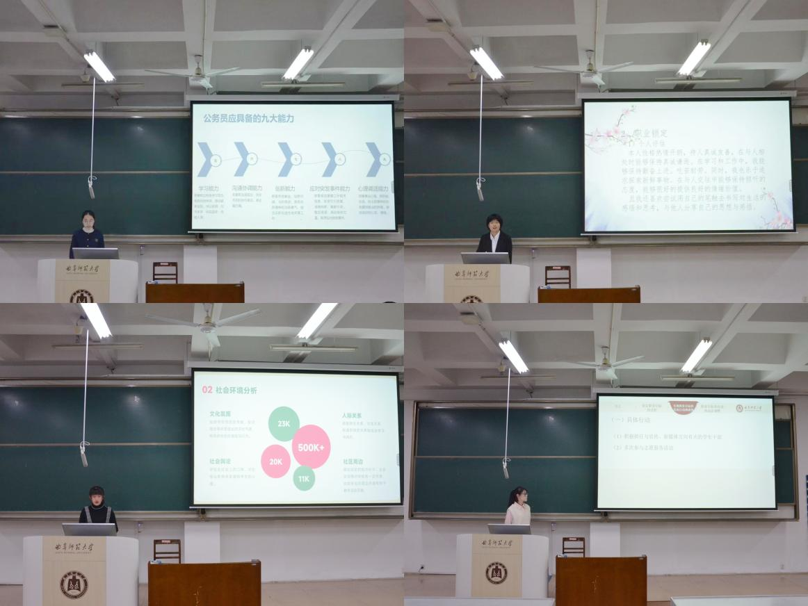本次比赛分为现场展示和评委提问两个环节。比赛现场,参赛选手们深入剖析自我,依据个人兴趣、能力与价值观,清晰阐述独特的职业规划路径。有的同学结合专业优势,立志在公职领域服务社会;有的则心怀对教育事业的热爱,致力于成为优秀教师。各位评委针对选手的答辩情况进行针对性提问,从行业动态到个人发展策略,从短期计划到长期目标,选手冷静应答,展现出较为良好的应变能力与专业素养。