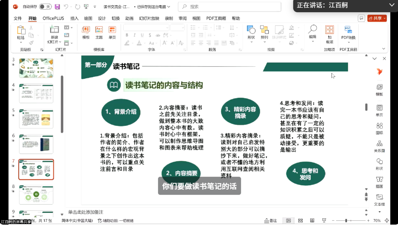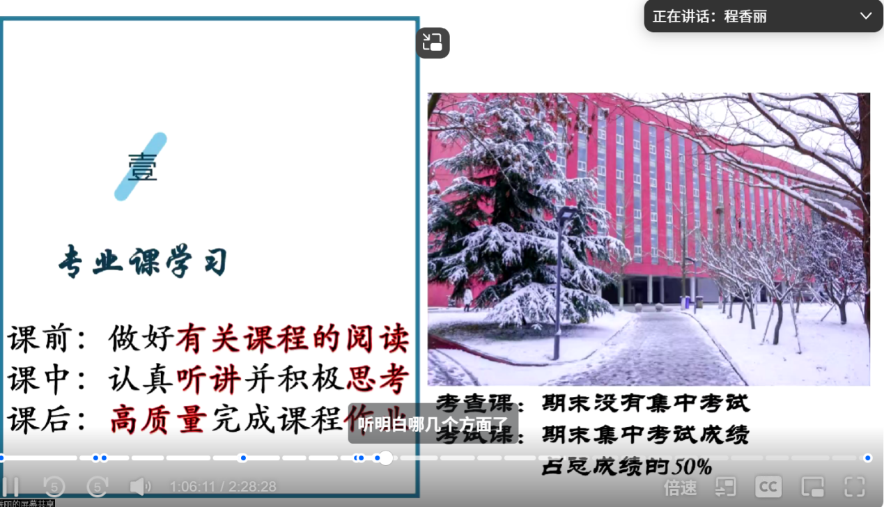 张继政和江百舸代表政治学专业介绍了一系列读书方法和学习方法,分别从历史、官僚政治角度和专业课学习角度具体展开分享,通过展示自己的部分读书笔记和阅读书目,为新生们提供了很好的阅读思路及整理思路,指导同学们的专业课学习。最后,程香丽老师对于前两位同学的分享做出总结,并进一步拓展专业学习和阅读的相关方法,以一位优秀学生为例为新生们做出进一步的指导,期待同学们在大学中的进一步成长。