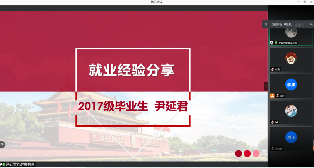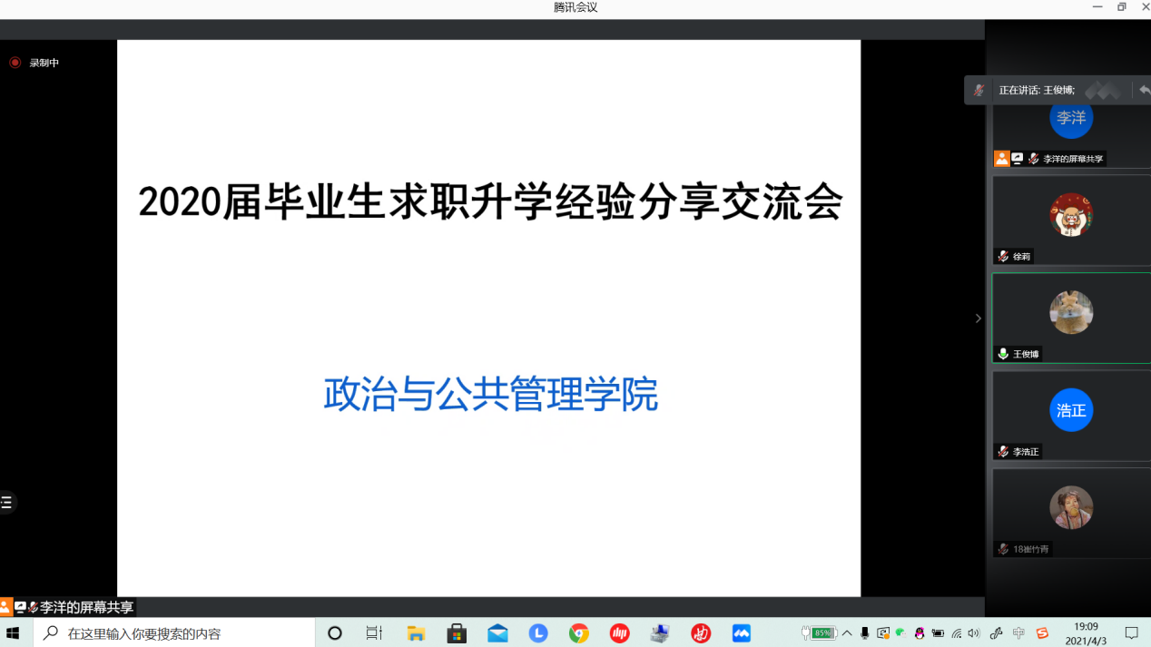 4月3日晚上7:00在腾讯会议平台召开“事业单位类”求职经验分享会,会议邀请2020届马克思主义哲学专业毕业生王俊博作为主讲人,分享自己在求职过程中总结的求职经验。针对事业单位笔试和面试两部分的准备分别给出建议,叮嘱大家要多总结国考省考事业编的考试内容,以真题为核心,把握考试重点,摸清考试范围;面试部分则要通过自己录音、录像反复练习,积极与老师、同学交流,及时发现自身不足,不断完善个人能力。