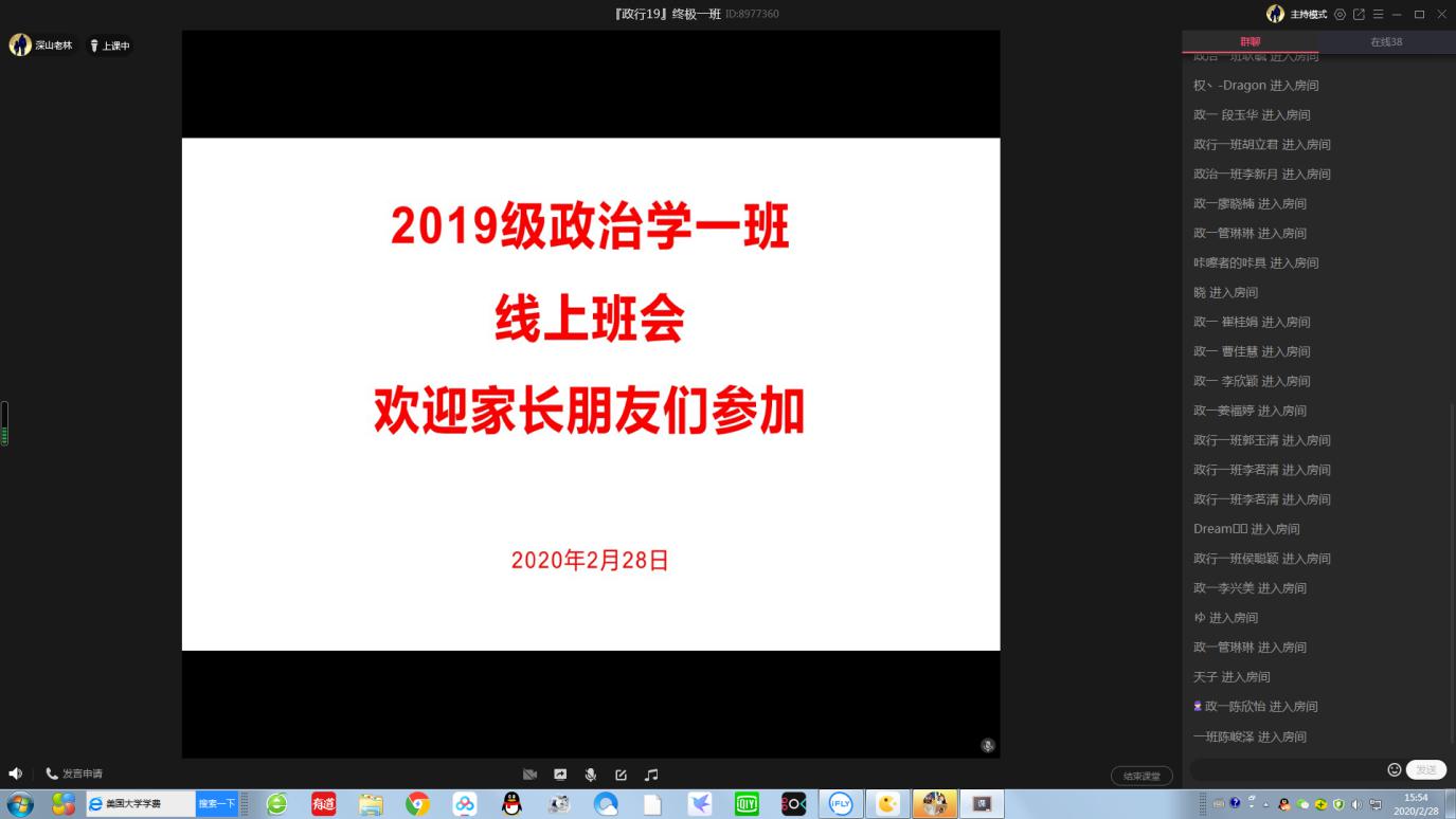 副院长、2019级政治一班班主任林士俊为政治一班全体同学召开线上班会。会上,提出“比学赶帮超”的学习计划,引导学生互补互惠,共同促进发展;对学生居家线上上课提出要求,上课穿戴整齐,以良好的精神面貌投入到课堂学习中,做好课前准备工作和课后复习工作;充分利用网络相关资源,增加识储备,走出舒适圈,做好居家学习规划。