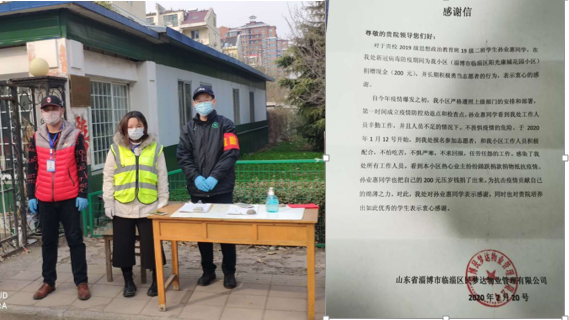 发来感谢信,表达了对她这一举动的高度评价与赞扬。2019级思政二班的孙业惠同学在新冠病毒防疫期间为所在小区做出突出贡献,小区物业特向她发来感谢信,对其当仁不让、冲锋在前的精神表示肯定与赞赏,对其捐赠现金、志愿服务的行为表达衷心感谢。