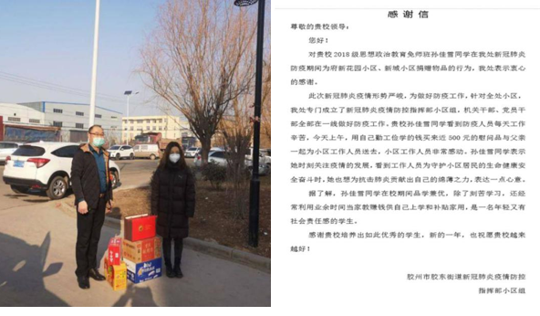 除此之外,学部学子尽己之能助力一线,以实际行动为抗疫加油,获得了社会外界的好评。2018级思政免师班的孙佳雪同学用自己课余时间勤工俭学赚来的近五百元钱为当地参与防疫一线的工作人员买来八宝粥、方便面等物品。胶州市胶东街道新冠肺炎疫情防控指挥部小区组向金沙娱乐