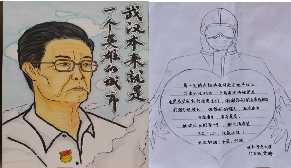 弘道宣讲团以及学部众多班级制作祝福视频,用声音的力量为每一座城市中惴惴不安的人们驱散阴霾;刘智杰、杨璐璐、庞雅慧、詹丽菲等同学也用书法、绘画的方式诠释拳拳赤子之心;马子训则用诗词表达了对武汉的美好祝愿和抗击疫情的决心和信心。